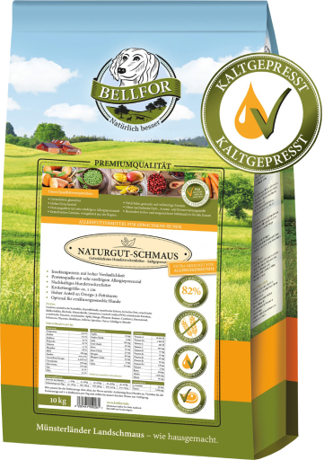 Und diesen Anspruch haben wir auch an unseren Münsterländer Landschmaus, getreidefreies Hundetrockenfutter. Bellfor ist ein Familienbetrieb, der rund 25 Jahre Erfahrung in der Herstellung von Hundefutter besitzt. Wir sind davon überzeugt, dass es jedes Tier verdient, nur qualitativ hochwertiges, natürliches und artgerechtes Hundefutter zu bekommen. Der beste Freund des Menschen soll nicht einfach satt sein, sondern gesund, vital und vor allem glücklich. Darum setzen wir auf ein gesundes, getreidefreies Hundetrockenfutter wie hausgemacht. Dazu gehören für uns: ausschließlich natürliche Zutaten. Hunde sind Semi-Carnivoren aus diesem Grund enthält unser Bellfor Hundefutter um die 70 % Fleisch oder Fisch. Das verwendete Fleisch stammt nicht aus Massentierhaltung, sondern aus artgerechter Tierhaltung von regionalen, langjährigen Partnern und hat Lebensmittelqualität. Unser getreidefreies Hundetrockenfutter enthält viel frisches Obst, Gemüse und wertvolle Kräuter weitgehend aus unserer Region.